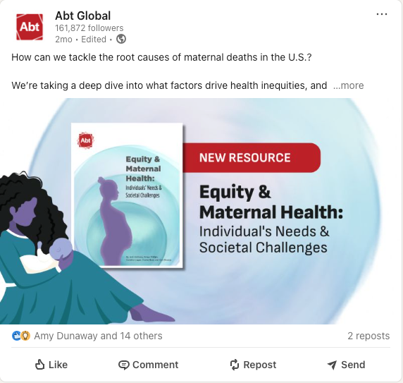 I’m experienced in collaborating to create social media graphics that engage and convert. At Abt Global, I worked with writers and social media managers to develop a visual template system for each content type—such as conferences, quotes, and resources—so our team could quickly produce on-brand graphics that still felt fresh and distinctive.